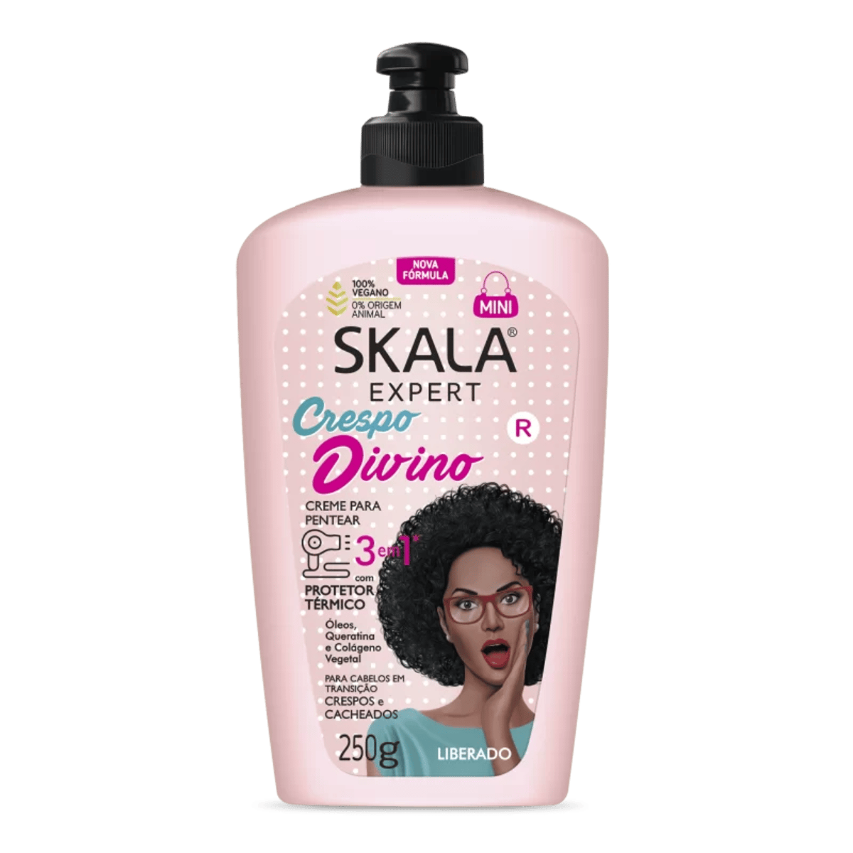 O Creme para Pentear Skala Expert Crespo Divino é 100% vegano e não testado em animais. Sua fórmula 3 em 1 contém protetor térmico, óleos, queratina e colágeno vegetal, proporcionando hidratação, definição e controle dos fios. Ideal para cabelos em transição, crespos e cacheados, garantindo força e brilho. Disponível em embalagem de 250g.