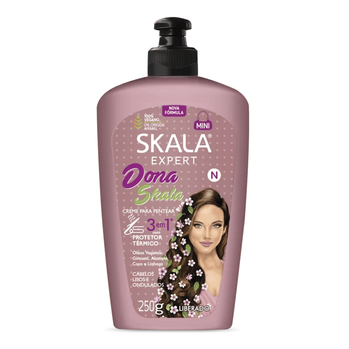 O Creme para Pentear Skala Expert Dona Skala é 100% vegano e não testado em animais. Sua fórmula 3 em 1 contém protetor térmico e óleos vegetais de girassol, abacate, coco e linhaça, proporcionando hidratação profunda e controle dos fios. Ideal para cabelos lisos e ondulados, garante força e brilho. Disponível em embalagem de 250g.